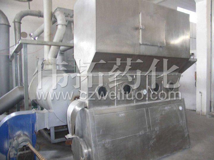 沸腾干燥,又称流化床,它是由空气过滤器、加热器、沸腾床主机,旋风分离器,布袋除尘器、高压离心风机、操作台组成,由于干燥物料的性质不同,配套除尘设备时,可按需要考虑,可同时选择旋风分离器、布袋除尘器,也可选择其中一种,一般来说比重较大的如冲剂及颗粒料干燥只需选择旋风分离器,比重较轻的小颗粒状和粉状物料需配套布袋除尘器,并备有气力送料装置及皮带输送机供选择。
